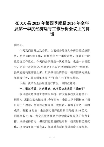 【七哥公文】2025年:在XX县2025年第四季度暨2026年全年及第一季度经济运行工作分析会议上的讲话+更多免费公文+VX:QiGeGongWen2024