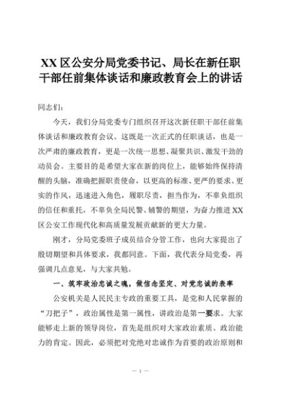 【七哥公文】2025年:XX区公安分局党委书记、局长在新任职干部任前集体谈话和廉政教育会上的讲话+更多免费公文+VX:QiGeGongWen2024