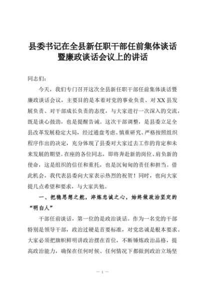 【七哥公文】2025年:县委书记在全县新任职干部任前集体谈话暨廉政谈话会议上的讲话+更多免费公文+VX:QiGeGongWen2024