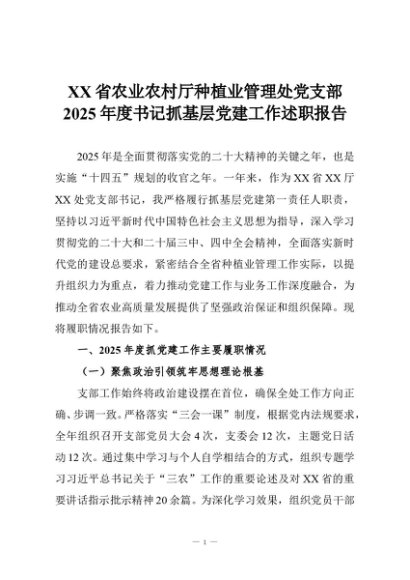 【七哥公文】2025年:XX省农业农村厅种植业管理处党支部2025年度书记抓基层党建工作述职报告+更多免费公文+VX:QiGeGongWen2024