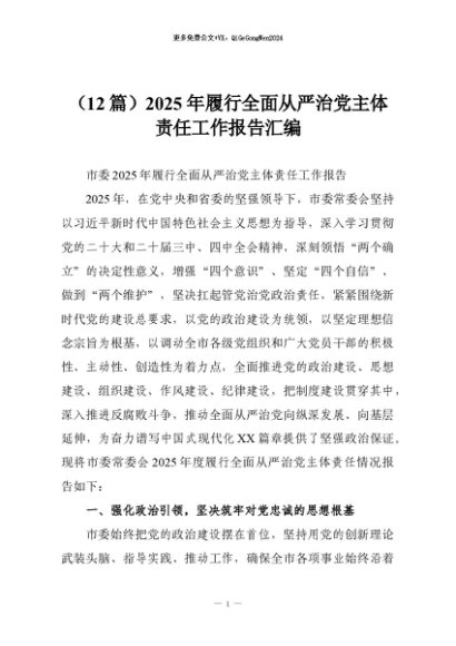 【七哥公文】2025年:(12篇)2025年履行全面从严治党主体责任工作报告汇编+更多免费公文+VX:QiGeGongWen2024