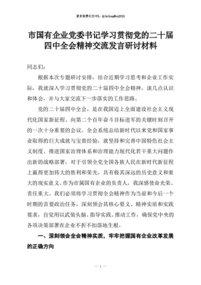 【七哥公文】2025年:市国有企业党委书记学习贯彻党的二十届四中全会精神交流发言研讨材料+更多免费公文+VX:QiGeGongWen2024