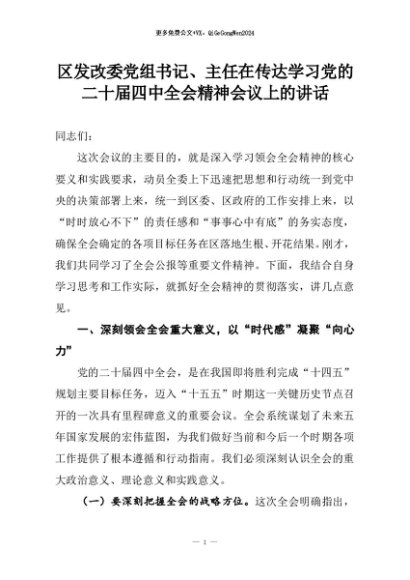 【七哥公文】2025年:区发改委党组书记、主任在传达学习党的二十届四中全会精神会议上的讲话+更多免费公文+VX:QiGeGongWen2024
