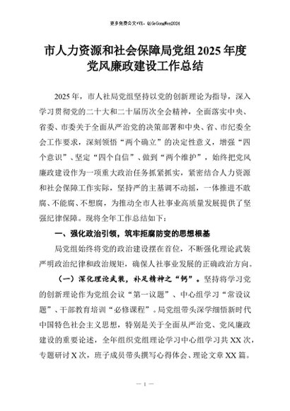 【七哥公文】2025年:市人力资源和社会保障局党组2025年度党风廉政建设工作总结+更多免费公文+VX:QiGeGongWen2024