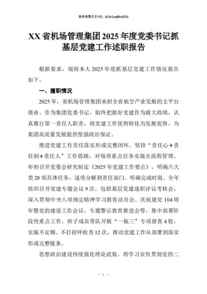 【七哥公文】2025年:XX省机场管理集团2025年度党委书记抓基层党建工作述职报告+更多免费公文+VX:QiGeGongWen2024