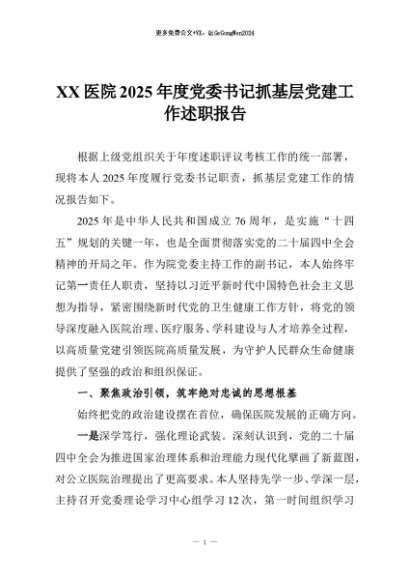 / 【七哥公文】2025年:XX医院2025年度党委书记抓基层党建工作述职报告+更多免费公文+VX:QiGeGongWen2024