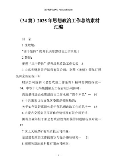 / 【七哥公文】2025年:(34篇)2025年思想政治工作总结素材汇编+更多免费公文+VX:QiGeGongWen2024