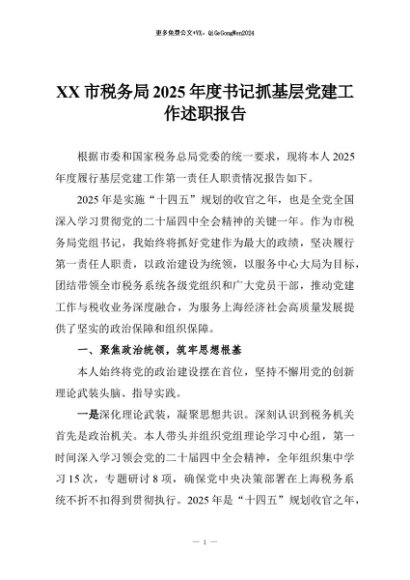 【七哥公文】2025年:XX市税务局2025年度书记抓基层党建工作述职报告+更多免费公文+VX:QiGeGongWen2024