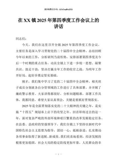 / 【七哥公文】2025年:在XX镇2025年第四季度工作会议上的讲话+更多免费公文+VX:QiGeGongWen2024