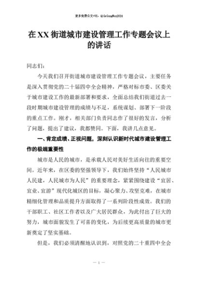 / 【七哥公文】2025年:在XX街道城市建设管理工作专题会议上的讲话+更多免费公文+VX:QiGeGongWen2024