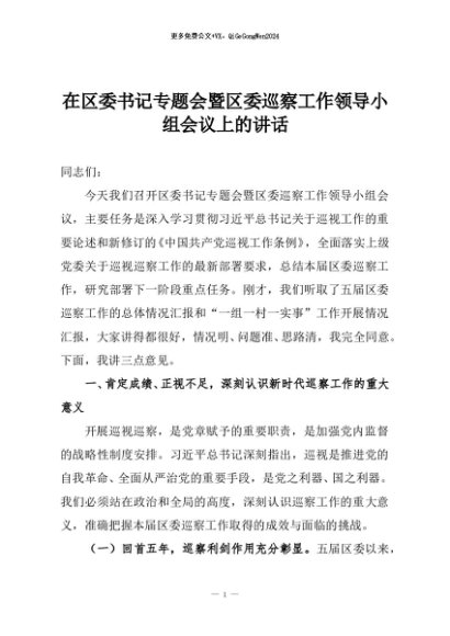 【七哥公文】2025年:在区委书记专题会暨区委巡察工作领导小组会议上的讲话+更多免费公文+VX:QiGeGongWen2024