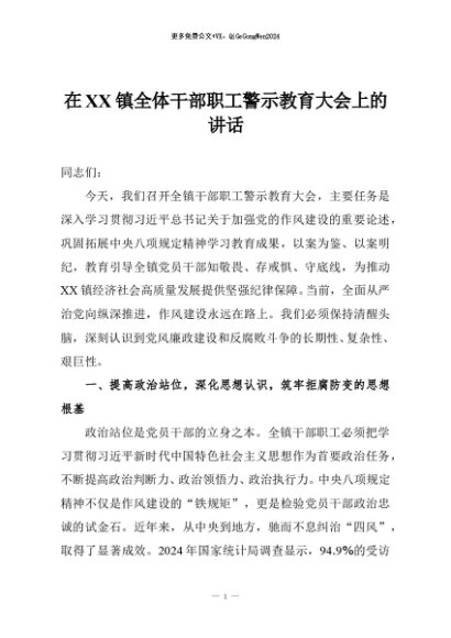 / 【七哥公文】2025年:在XX镇全体干部职工警示教育大会上的讲话+更多免费公文+VX:QiGeGongWen2024