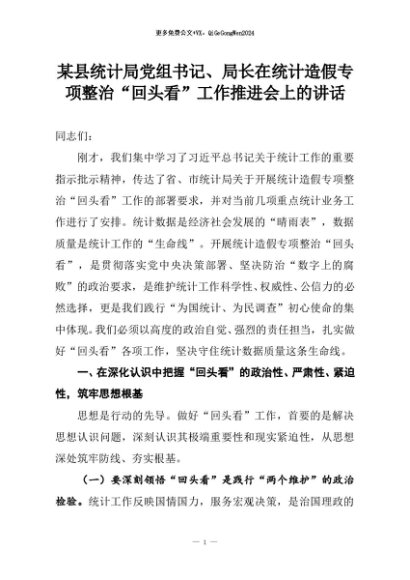 【七哥公文】2025年:某县统计局党组书记、局长在统计造假专项整治“回头看”工作推进会上的讲话+更多免费公文+VX:QiGeGongWen2024