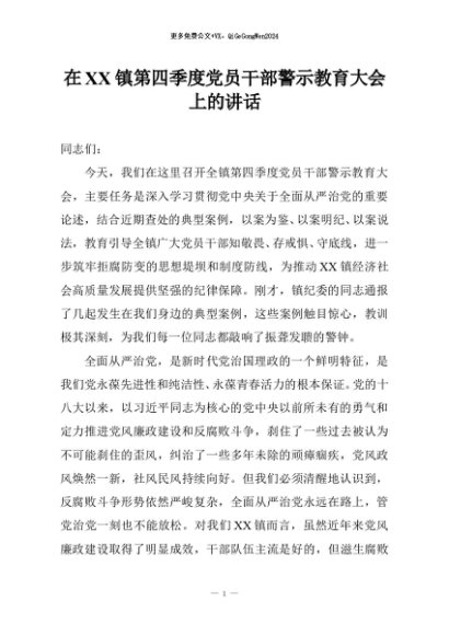 / 【七哥公文】2025年:在XX镇第四季度党员干部警示教育大会上的讲话+更多免费公文+VX:QiGeGongWen2024