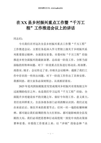 【七哥公文】2025年:在XX县乡村振兴重点工作暨“千万工程”工作推进会议上的讲话+更多免费公文+VX:QiGeGongWen2024