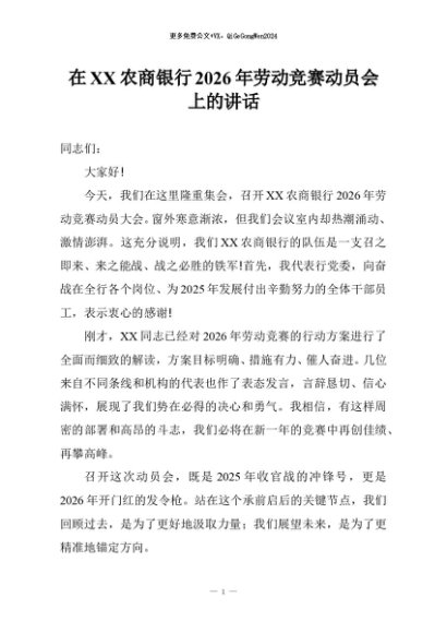 / 【七哥公文】2025年:在XX农商银行2026年劳动竞赛动员会上的讲话+更多免费公文+VX:QiGeGongWen2024