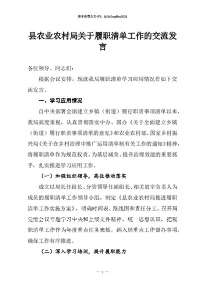 / 【七哥公文】2025年:县农业农村局关于履职清单工作的交流发言+更多免费公文+VX:QiGeGongWen2024