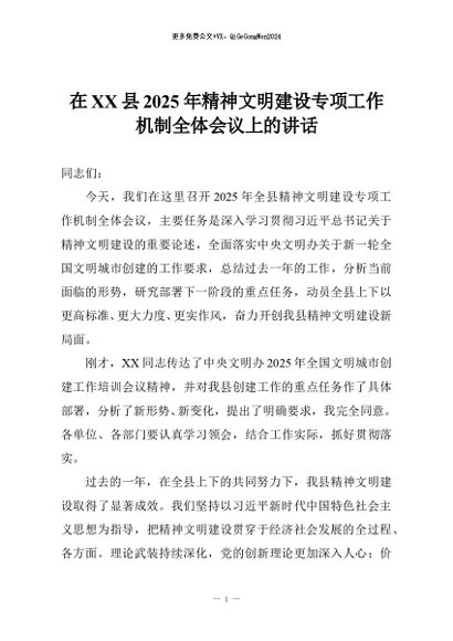 【七哥公文】2025年:在XX县2025年精神文明建设专项工作机制全体会议上的讲话+更多免费公文+VX:QiGeGongWen2024