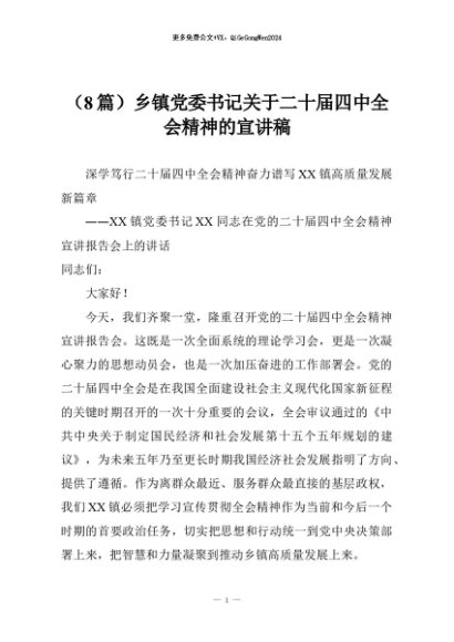 【七哥公文】2025年:(8篇)乡镇党委书记关于二十届四中全会精神的宣讲稿+更多免费公文+VX:QiGeGongWen2024
