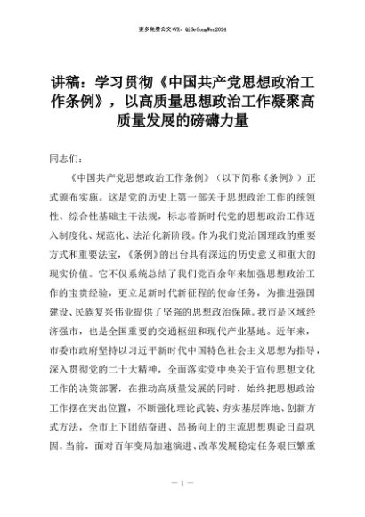 【七哥公文】2025年:讲稿:学习贯彻《中国共产党思想政治工作条例》,以高质量思想政治工作凝聚高质量发展的磅礴力量+更多免费公文+VX:QiGeGongWen2024