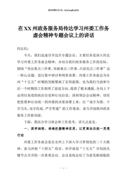 【七哥公文】2025年:在XX州政务服务局传达学习州委工作务虚会精神专题会议上的讲话+更多免费公文+VX:QiGeGongWen2024
