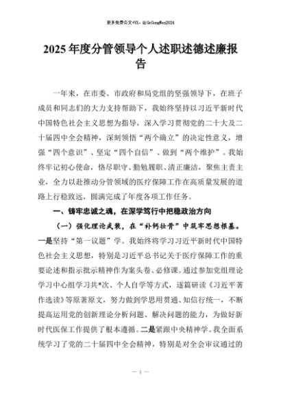 / 【七哥公文】2025年:2025年度分管领导个人述职述德述廉报告+更多免费公文+VX:QiGeGongWen2024