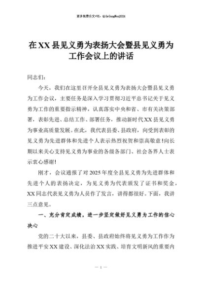 【七哥公文】2025年:在XX县见义勇为表扬大会暨县见义勇为工作会议上的讲话+更多免费公文+VX:QiGeGongWen2024