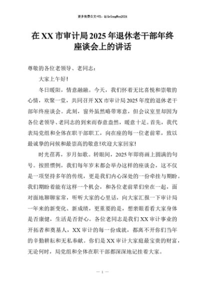 【七哥公文】2025年:在XX市审计局2025年退休老干部年终座谈会上的讲话+更多免费公文+VX:QiGeGongWen2024