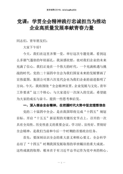 【七哥公文】2025年:党课:学贯全会精神践行忠诚担当为推动企业高质量发展奉献青春力量+更多免费公文+VX:QiGeGongWen2024