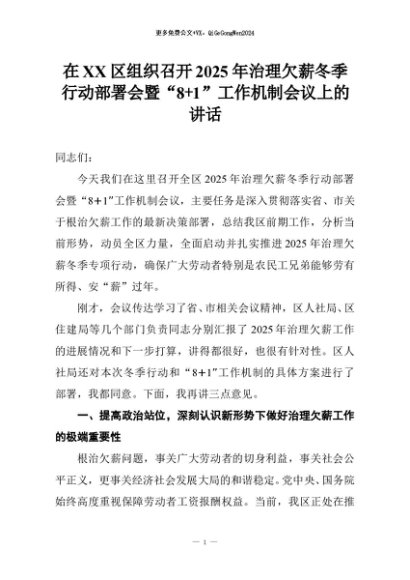 【七哥公文】2025年:在XX区组织召开2025年治理欠薪冬季行动部署会暨“8+1”工作机制会议上的讲话+更多免费公文+VX:QiGeGongWen2024