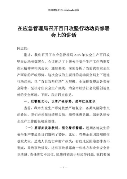 / 【七哥公文】2025年:在应急管理局召开百日攻坚行动动员部署会上的讲话+更多免费公文+VX:QiGeGongWen2024
