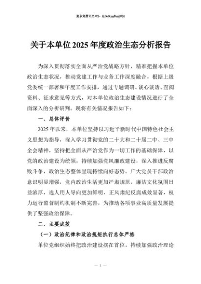 / 【七哥公文】2025年:关于本单位2025年度政治生态分析报告+更多免费公文+VX:QiGeGongWen2024
