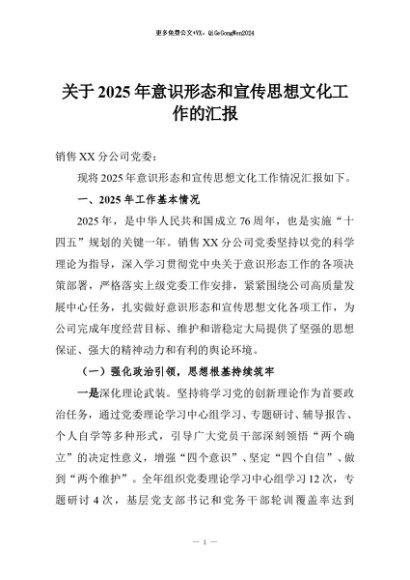 / 【七哥公文】2025年:关于2025年意识形态和宣传思想文化工作的汇报+更多免费公文+VX:QiGeGongWen2024