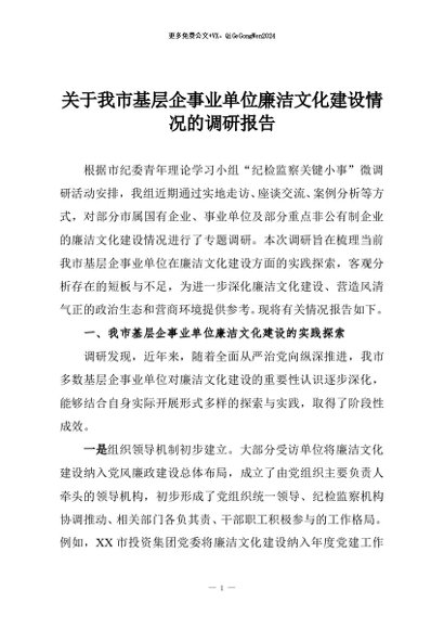 / 【七哥公文】2025年:关于我市基层企事业单位廉洁文化建设情况的调研报告+更多免费公文+VX:QiGeGongWen2024