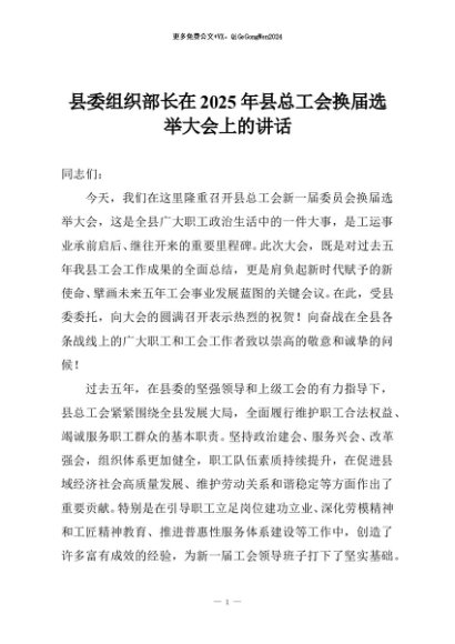 【七哥公文】2025年:县委组织部长在2025年县总工会换届选举大会上的讲话+更多免费公文+VX:QiGeGongWen2024