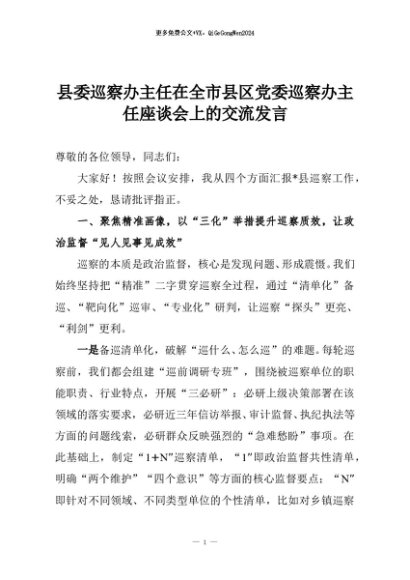 【七哥公文】2025年:县委巡察办主任在全市县区党委巡察办主任座谈会上的交流发言+更多免费公文+VX:QiGeGongWen2024