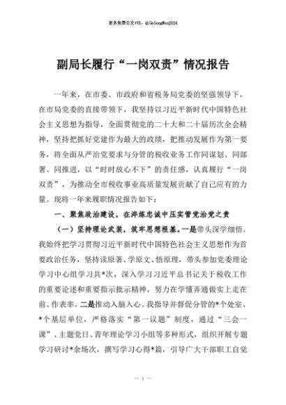 / 【七哥公文】2025年:副局长履行“一岗双责”情况报告+更多免费公文+VX:QiGeGongWen2024
