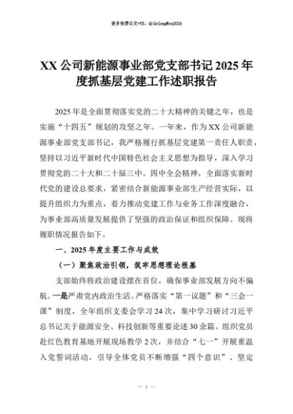 【七哥公文】2025年:XX公司新能源事业部党支部书记2025年度抓基层党建工作述职报告+更多免费公文+VX:QiGeGongWen2024