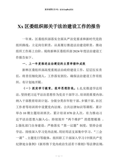 / 【七哥公文】2025年:Xx区委组织部关于法治建设工作的报告+更多免费公文+VX:QiGeGongWen2024
