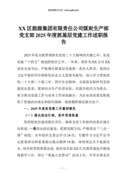 【七哥公文】2025年:XX区能源集团有限责任公司煤炭生产部党支部2025年度抓基层党建工作述职报告+更多免费公文+VX:QiGeGongWen2024