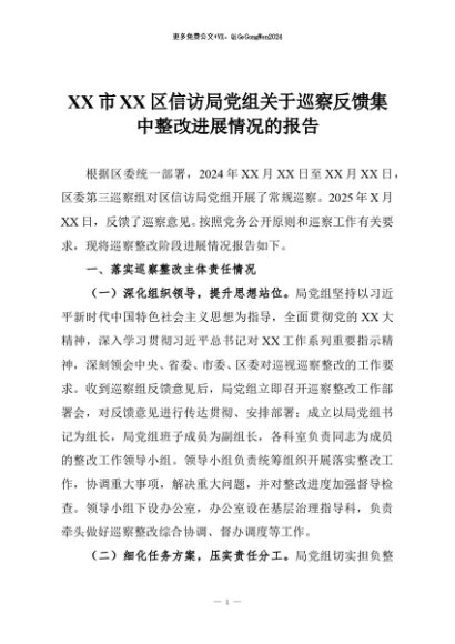 【七哥公文】2025年:XX市XX区信访局党组关于巡察反馈集中整改进展情况的报告+更多免费公文+VX:QiGeGongWen2024