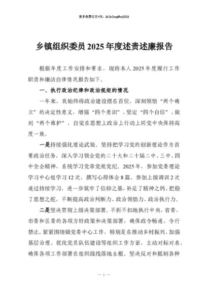 / 【七哥公文】2025年:乡镇组织委员2025年度述责述廉报告+更多免费公文+VX:QiGeGongWen2024