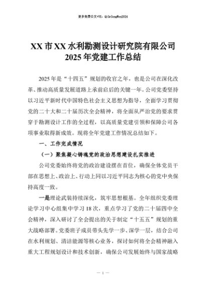 【七哥公文】2025年:XX市XX水利勘测设计研究院有限公司2025年党建工作总结+更多免费公文+VX:QiGeGongWen2024