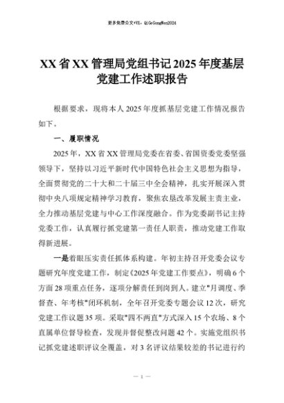 【七哥公文】2025年:XX省XX管理局党组书记2025年度基层党建工作述职报告+更多免费公文+VX:QiGeGongWen2024