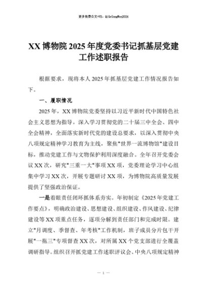 【七哥公文】2025年:XX博物院2025年度党委书记抓基层党建工作述职报告+更多免费公文+VX:QiGeGongWen2024