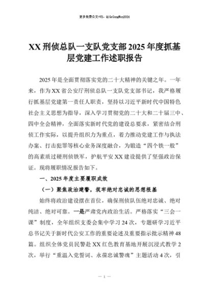 【七哥公文】2025年:XX刑侦总队一支队党支部2025年度抓基层党建工作述职报告+更多免费公文+VX:QiGeGongWen2024