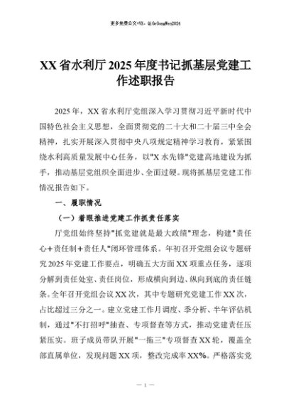 / 【七哥公文】2025年:XX省水利厅2025年度书记抓基层党建工作述职报告+更多免费公文+VX:QiGeGongWen2024