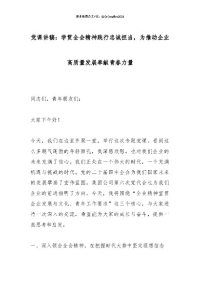 【七哥公文】2025年:党课讲稿:学贯全会精神践行忠诚担当,为推动企业高质量发展奉献青春力量_副本+更多免费公文+VX:QiGeGongWen2024