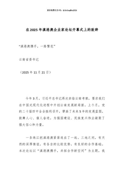 【七哥公文】2025年:在2025年滇港澳企业家论坛开幕式上的致辞_副本+更多免费公文+VX:QiGeGongWen2024