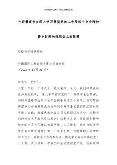【七哥公文】2025年:公司董事长在深入学习贯彻党的二十届四中全会精神暨乡村振兴推进会上的致辞_副本+更多免费公文+VX:QiGeGongWen2024